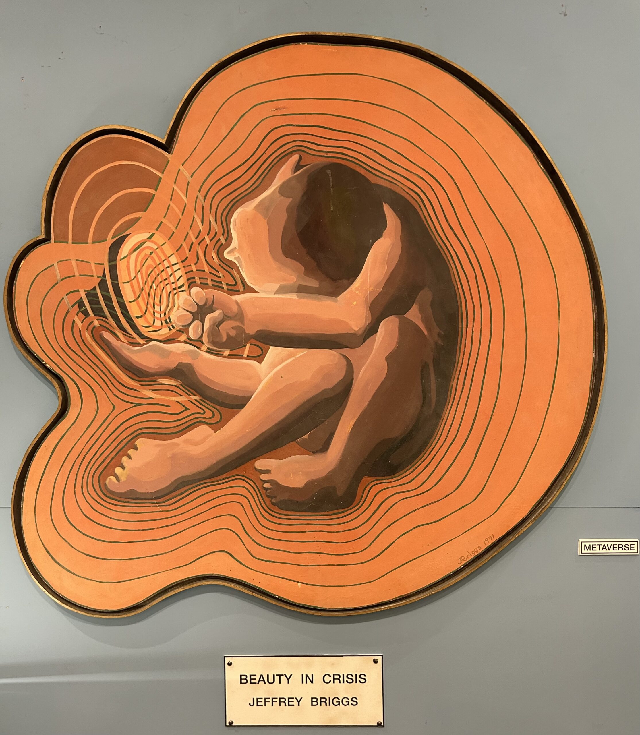 A presentation of beautifully crafted medals visualizes environmental loss and the possible futures of human habitation. They depict a symbolic figure within an enclosed environment—the circular forms represent both physical and atmospheric boundaries. While humans are adaptable, Jeff’s artwork underscores our fundamental dependence on Earth’s ecological and natural resources and the fragile balance required to sustain life.